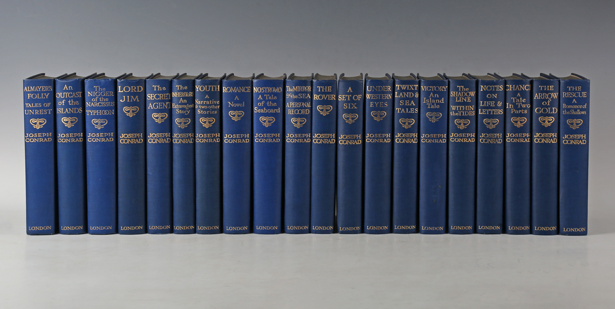 CONRAD, Joseph. [The Works.] Edinburgh and London: John Grant, 1925. 20 vols., 8vo (212 x 134mm.) 20 photogravure frontispieces. (Occasional spotting to preliminaries.) Original blue cloth. Provenance: Malcolm Edward Morgan (bookplate to front pastedown of vol. 1) (20).