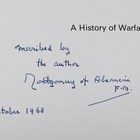 MONTGOMERY, of Alamein [Bernard Law.] A History of Warfare. London: Collins, 1968. First edition, signed by Montgomery of Alamein, 8vo (247 x 175mm.) Photographic illustrations. (Toning.) Original red cloth (slight weakening to inner hinge), dust-jacket (price-clipped, small tears to edges). Note: includes a hand-written letter addressed to Montgomery seeking an invitation to meet him so that Montgomery can sign this book. Overleaf in red ink Mongtomery has written: ‘Yes, certainly. Come on Tuesday October 22, at 11 am. Or on Thursday October 24, M of A, 17-10-68’.