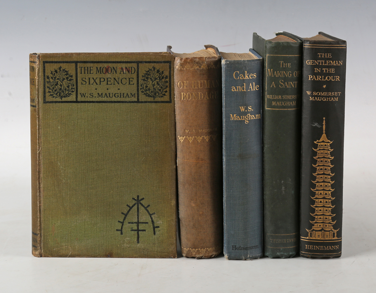 MAUGHAM, Somerset. The Moon and Sixpence. London: William Heinemann, 1919. First edition, first issue, 8vo (185 x 120mm.) Half-title, 4pp. publisher’s advertisements to rear. (Heavily browned, lacking blanks.) Original green cloth (endpapers replaced, spine ends repaired, minor scuffing, discolouring). Note: Maugham’s novel that was based on the life of Paul Gaugin. The first issue has three novels by Israel Zangwill and six works by Eden Phillpotts listed in the publisher’s advertisements. – And a further nineteen volumes by Somerset Maugham (including ‘Of Human Bondage’, 1915, first edition, 8vo, and ‘Cakes and Ale’, 1930, first issue, 8vo, and ‘The Making of a Saint’, 1898, first U.K. edition, 8vo, and ‘The Gentleman in the Parlour’, 1930, 8vo) (20).