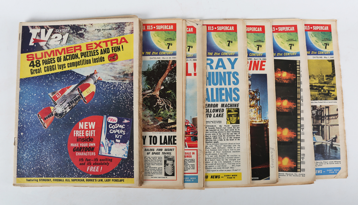 COMICS. TV 21 Century. London: City Magazines, January 23 2065 [1965] – January 14 2067 [1967]. Universe Edition No. 1- Universe Edition No. 104. 104 issues, 4to (362 x 264mm.) Colour and black and white illustrations, advertisements. (Toning, minor shipping.) Paper wrappers (small marginal tear to issue 1). – And a further five issues (‘Thunderbirds Extra’, 1966, and ‘Summer Extra’, 1965, and duplicate issues of No. 32, 37, and 53). Note: issue no. 52 saw the first appearance of the ‘Thunderbirds’ comic strip but ‘Lady Penelope and Parker’ were in the comic from the first issue in January 1965 (109).