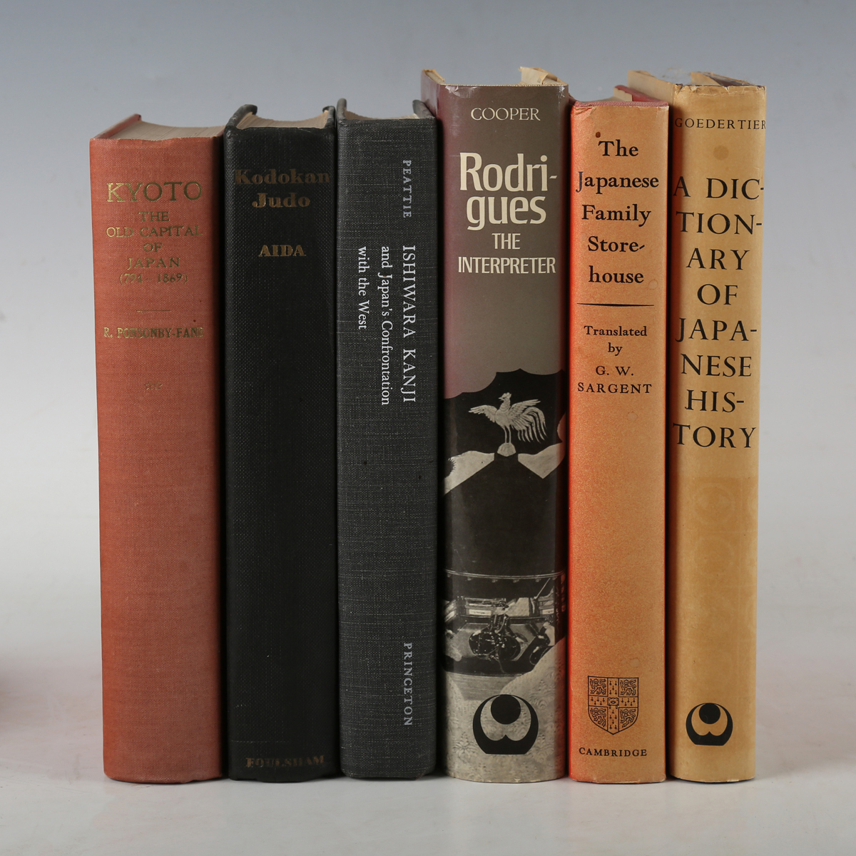 JAPAN. – R.A.B. PONSONBY-FANE. Kyoto, The Old Capital of Japan (794-1869). Japan, Kyoto: The Ponsonby Memorial Society, 1956. 8vo (210 x 146mm.) Photographic plates. (Mild toning.) Original red cloth (slight fading.) – And a further twenty-two volumes related to Japanese society and culture (including Hikoichi Aida’s ‘Kodokan Judo’, [1956], 8vo, and Mark R. Peattie’s ‘Ishiwara Kanji and Japan’s Confrontation with the West’, inscribed by the author, 1975, 8vo, and Michael Cooper, S.J.’s ‘Rodrigues The Interpreter’, 1974, 8vo, and Shusaku Endo’s ‘Silence’, 1972, 8vo) (22).