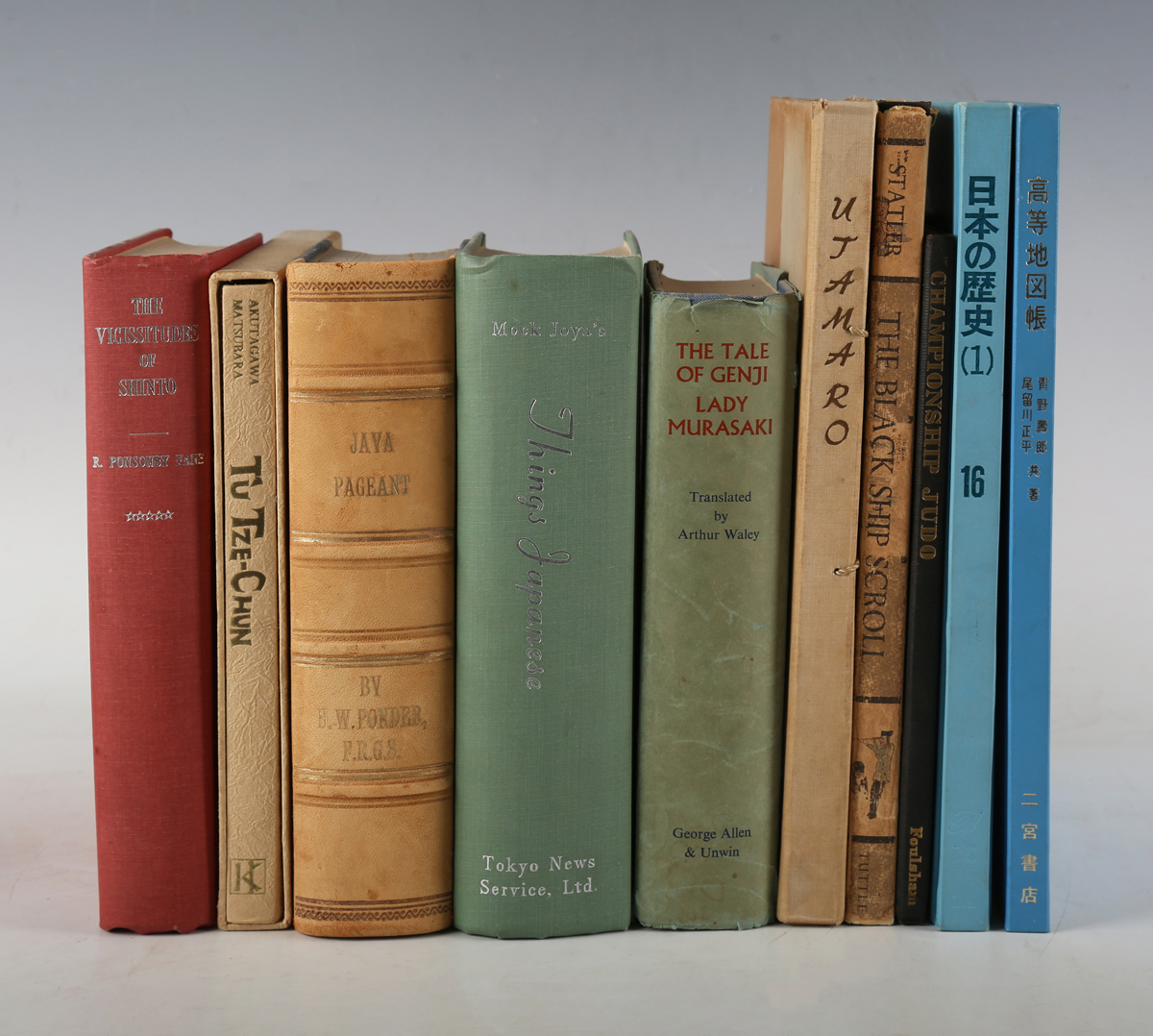 JAPAN. – R.A.B. PONSONBY-FANE. The Vicissitudes of Shinto. Kyoto: The Ponsonby Memorial Society, 1963. First edition, 8vo (208 x 145mm.) (Mild toning.) Original red cloth (extremities bumped). – And a further forty-three volumes related to Japanese society and culture (including Lady Murasaki’s ‘The Tale of Genji’, 1965, 8vo, and Naoko Matsubara’s ‘Tutze-Chun’, 1965, 8vo, and Mock Joya’s ‘Things Japanese’, 1963, 8vo) (44).