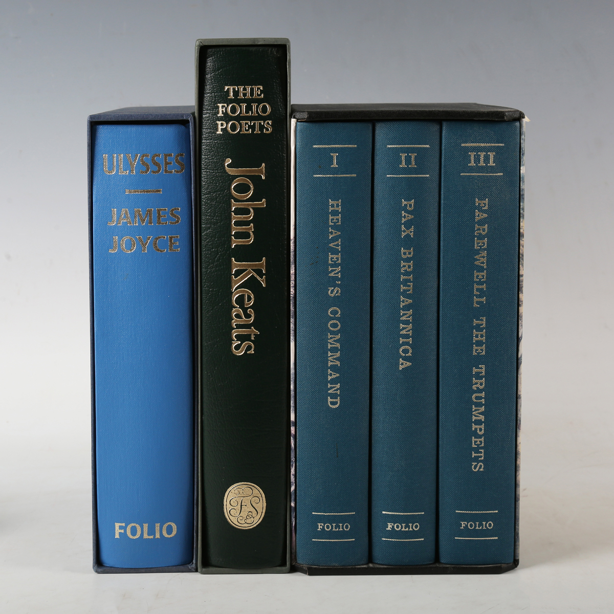 FOLIO SOCIETY. – James JOYCE. Ulysses. London: The Folio Society, 1998. 8vo (232 x 161mm.) Preface by Stephen James Joyce, etchings by Mimmo Paladino, introduction by Jacques Aubert. Original blue cloth, gilt portrait to upper cover, slipcase. – And a further twenty-six volumes published by The Folio Society (including ‘John Keats: The Complete Poems’, 2001, 8vo, and James Morris’ ‘Pax Brittanica’, 3 vols., 1993, 8vo) (27).