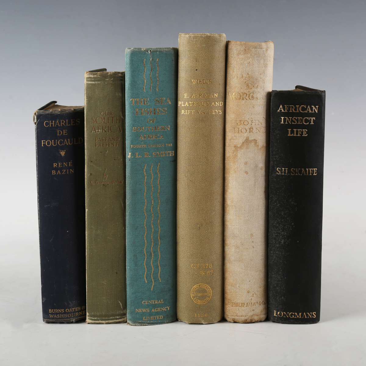 AFRICA. – H.H. AUSTIN. Among Swamps and Giants in Equatorial Africa. London: C. Arthur Pearson, Limited, 1902. First edition, 8vo (215 x 137mm.) 2 large folding maps in colour, photographic plates. (Lacking initial blank and front-free endpaper.) Original blue cloth (discoloured and stained, extremities frayed). Note: scarce. – And a further thirty-six volumes related to Africa (including René Bazin’s ‘Charles de Foucauld, Hermit and Explorer’, 1923, 8vo, and H. Rider Haggard’s ‘Maiwa’s Revenge’, 1888, 8vo) (37).