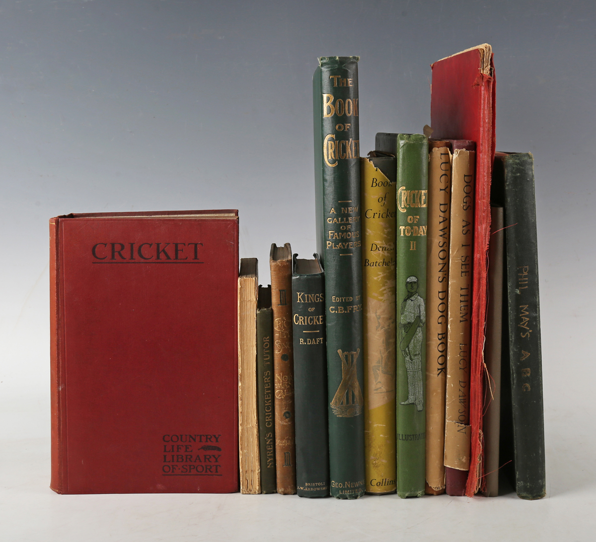 CRICKET. – Horace G. HUTCHINSON (editor). Cricket Illustrated. London: at the Offices of ‘Country Life’, 1903. First edition, 8vo (223 x 141mm.) Half-title, numerous photographic illustrations. (Mild toning, browning to endpapers.) Original red cloth, gilt lettering to spine (slight fading to spine and lower cover). – And a further twelve volumes, mostly relating to cricket (including ‘Cricket Clubs Annual, 1931’, [1930], 8vo, and John Nyren’s ‘The Young Cricketer’s Tutor’, 1902, 12mo) (13).