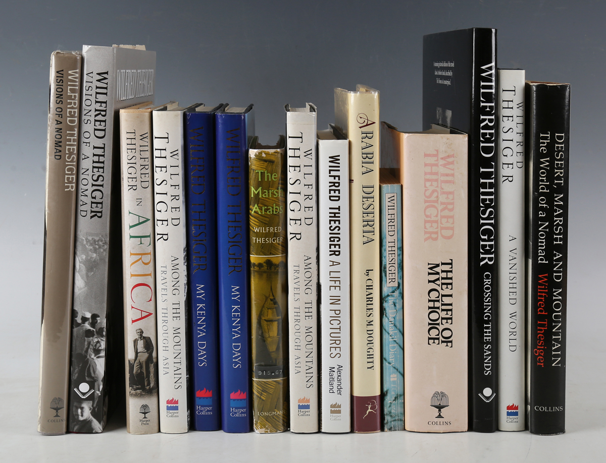 THESIGER, Wilfred. Visions of a Nomad. London: Collins, 1987. First edition, 4to (288 x 218mm.) Numerous photographic illustrations. (Toning.) Original brown cloth, dust-jacket . – And a further fourteen volumes by and about Wilfred Thesiger (including ‘The Marsh Arabs’, 1964, 8vo) (15).
