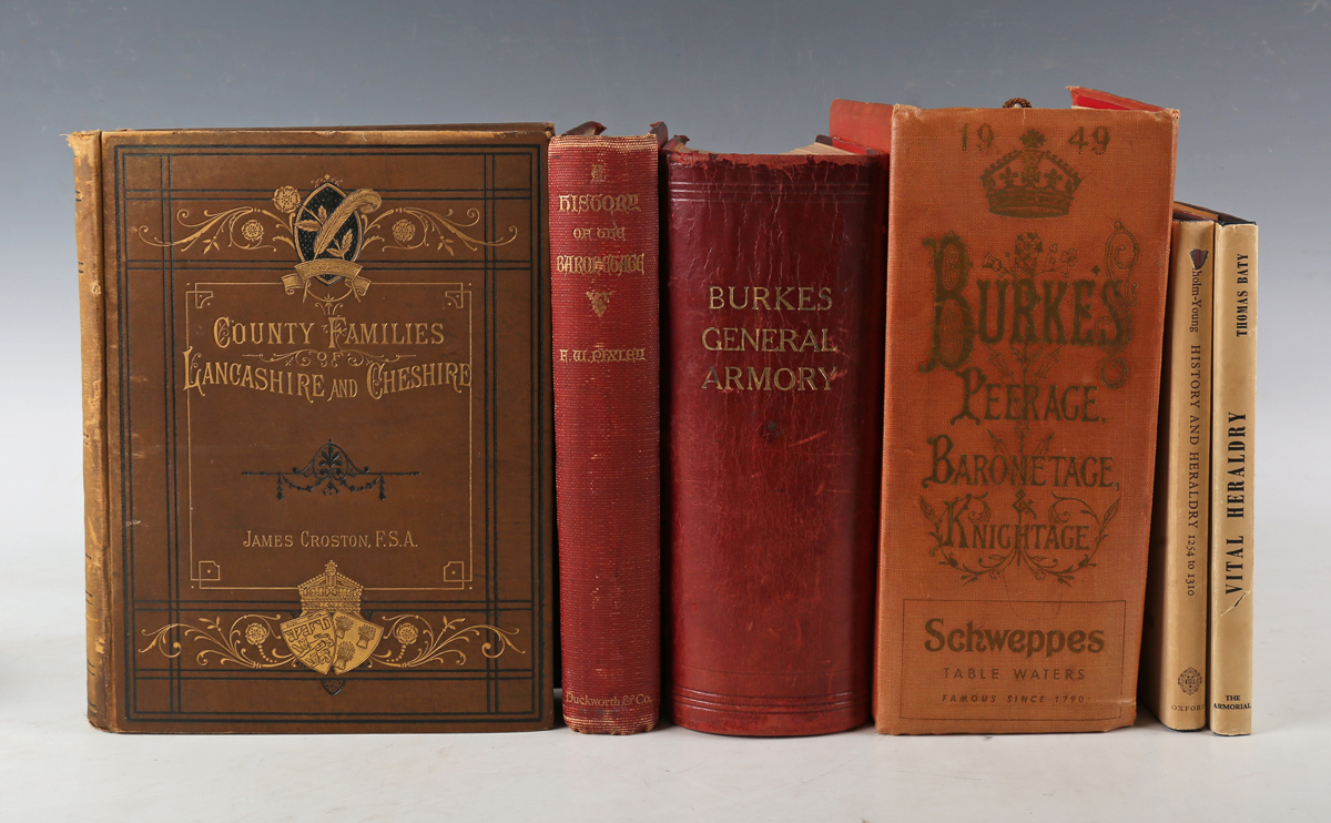 HERALDRY. – James CROSTON. County Families of Lancashire and Cheshire. Manchester: John Heywood, 1887. First edition, 4to (256 x 189mm.) Plates, illustrations in the text. (Toning.) Original brown cloth, decorative gilt to upper cover (staining to spine, wear to head of spine panel, inner hinge weakened). Provenance: Fred Colman (ink name inscribed verso frontispiece). – And approximately a further fifty-five volumes related to heraldry (including Francis Pixley’s ‘A History of the Baronetage’, limited edition being one of 210 copies, 1900, 4to, and John Burke and John Bernard Burke’s ‘Encyclopaedia of Heraldry, or General Armory of England, Scotland, and Ireland’, [1844], large 8vo, and N. Denholm-Young’s History and Heraldry 1254 to 1310’, 1965, 8vo) (approx. 56).