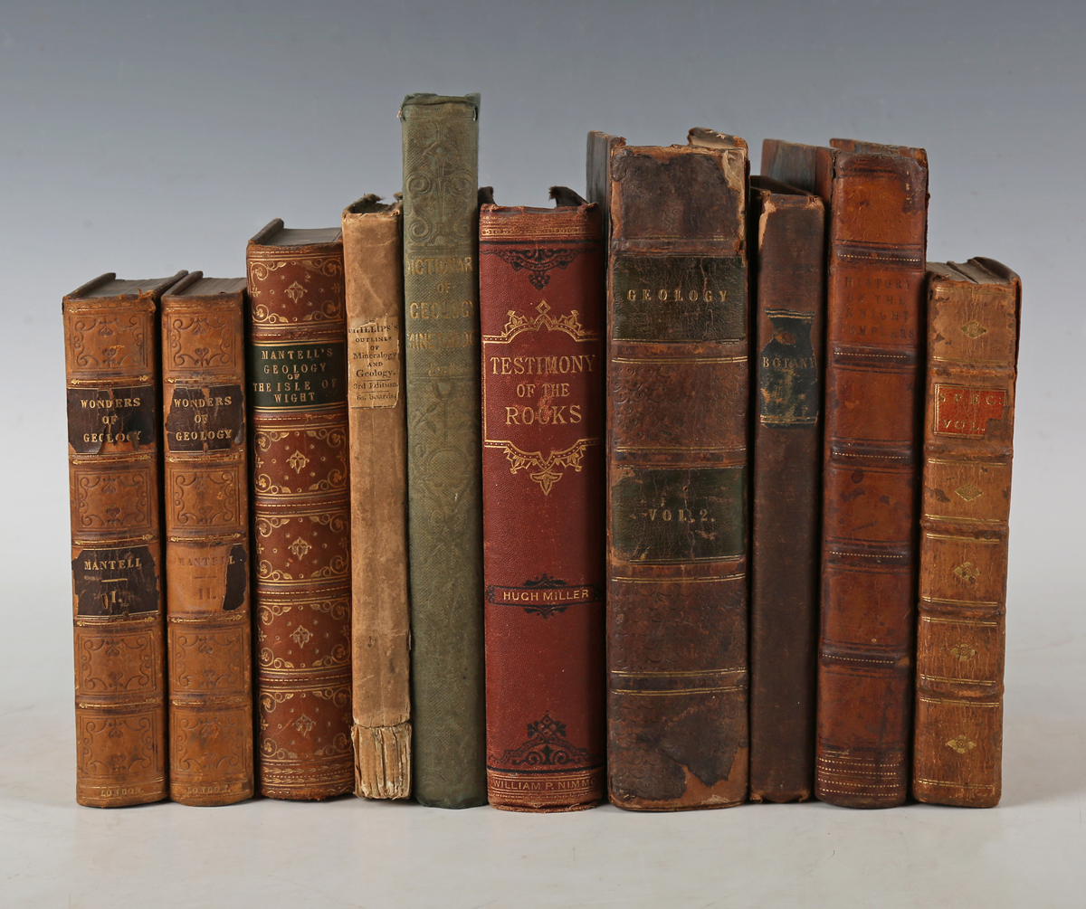 MANTELL, Gideon. The Wonders of Geology. London: Relfe and Fletcher, 1838. 2 vols., second thousand, 8vo (159 x 101mm.) Mezzotint frontispiece after John Martin, 6 colour lithographed plates, wood-engraved illustrations in the text. (Lacking half-title to vol. 1, toning, occasional light spotting, ink gift inscription to front pastedown, dated 1948.) Contemporary calf (some loss to lettering pieces, extremities rubbed). – And a further eight volumes (including Gideon Mantell’s ‘Geological Excursions Round the Isle of Wight’, 1847, 8vo, and William Phillips’ ‘Outlines of Mineralogy and Geology’, third edition, 1818, 12mo, and William Humble’s ‘Dictionary of Geology and Mineralogy’, 1840, 4to, and Hugh Miller’s ‘The Testimony of the Rocks’, 1872, 8vo) (9).