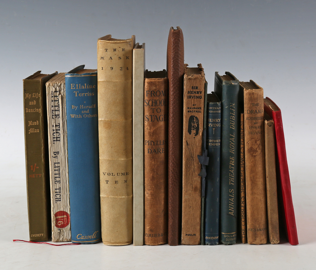 THEATRE. – Maud ALLAN. My Life and Dancing. London: Everett & Co., [n.d. but 1908.] First edition, 8vo (181 x 118mm.) Photographic plates. (Spotting, sometimes heavy, toning.) Original green cloth, lettering in red and gilt, mounted photographic illustration of Maud as ‘Salome’ to upper cover (some fading, extremities bumped). Provenance: Minnie Caroline Bell (bookplate to front pastedown). – And a further twenty-three related volumes (including [Sax Rhomer’s] ‘Little Tich’ by Little Tich, 1911, 8vo, and ‘The Mask, A Journal of the Art of Theatre’, vol. 10, 1924, 4to, and Ellaline Terriss’ ‘By Herself and with Others’, signed by Ellaline Terriss, 1928, 8vo, and ‘Plays Produced Under the Direction of David Belasco’, signed by David Belasco, 1925, 8vo, and Phyllis Dare’s ‘From School to Stage’, 1907, 8vo, and Walter Calvert’s ‘Sir Henry Irving and Miss Ellen Terry’, 1897, 4to) (24).