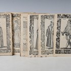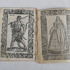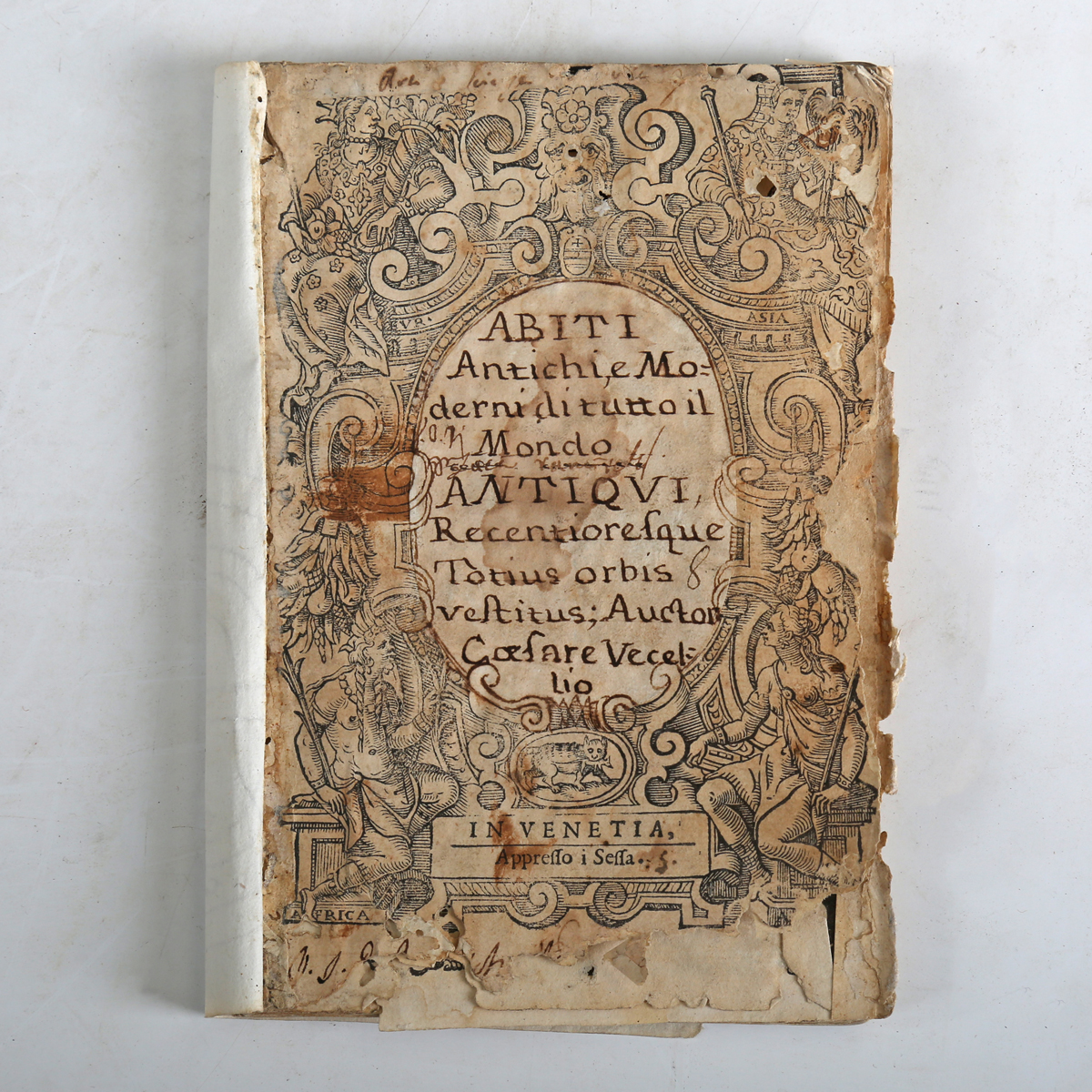 VECELLIO, Cesare. [Habiti antichi, et moderni di tutto il mondo.] Venice: Bernardo Sessa, 1598. Second edition, 8vo (169 x 110mm.) Title in contemporary manuscript on mounted paper overlay on title, woodcut surround, woodcut initials and decorations, 207 woodcut illustrations of people in Renaissance costume. (Lacking nearly 300 woodcuts and numerous text leaves, text-block broken, marginal losses to title, many leaves with marginal insect-damage, occasional damp-staining). Disbound. Note: an iconic and compendious work showing a vast range of European costume with an element of fantasy, too. Vecellio was a cousin of Titian, studied with him, and it is thought that Titian assisted him in the design of the illustrations.