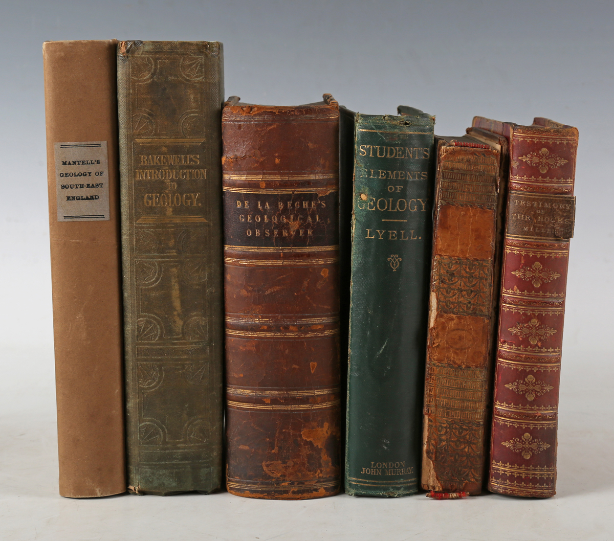 MANTELL, Gideon. The Geology of the South-East of England. London: Longman, Rees, Orme et al., 1833. First edition, 8vo (224 x 141mm.) Half-title, lithographed frontispiece, 5 lithographed plates, including 1 folding, folding geological map with hand-colouring to rear, 16pp. publisher’s advertisements to front, wood-engraved illustrations to the text. (Newspaper clippings mounted verso half-title and verso frontispiece, toning, spotting to plate margins, newspaper clipping mounted over publisher detail on title-page.) Contemporary boards, later paper label to spine (extremities rubbed, discolouring). Provenance: George Greig (gift inscription in ink, dated 1837). – And a further five related volumes (including Robert Bakewell’s ‘An Introduction to Geology’, fifth edition, 1838, 8vo, and Henry T. de la Beche’s ‘The Geological Observer’, 1851, 8vo, and Charles Lyell’s ‘The Student’s Elements of Geology’, 1871, 8vo) (6).
