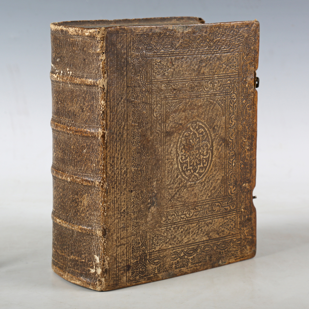 THEOLOGY. Der Wahre Romisch-Catholische Saltzburger. Saltzburg: Johann Joseph Manrs, 1745. Part 2 [of 2]. 4to (201 x 153mm.) Title in red and black, half-title, black letter. (Browning, marginal spotting throughout.) Contemporary blind-stamped pigskin, leather straps and brass claps (light rubbing, a few wormholes to lower cover, lacking one clasp). Note: an earlier part was published in 1737. A popular Catholic treatise that was intended to strengthen Catholic faith and refute Lutheran doctrine.