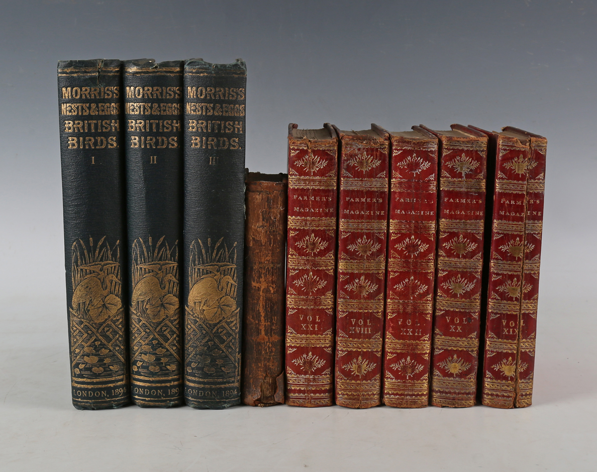 MORRIS, F.O. A Natural History of the Nests and Eggs of British Birds. London: John C. Nimmo, 1892. 3 vols., third edition, 4to (263 x 176mm.) Half-title, 245 chromolithographed plates. (Toning, spotting to preliminaries, thereafter occasional and light, one plate loose.) Original green cloth, pictorial gilt to covers and spines (some extremities rubbed, wear at head of spine panel of vol. one). – And a further sixteen volumes (including Thomas Mawe and John Abercrombie’s ‘Every Man his own Gardener. Being a new, and much more complete Gardener’s Kalendar’, 1779, 8vo, and Henry Stephen’s ‘The Book of the Farm’, 6 vols., 1891-1895, 8vo, and John Sproule’s ‘Elements of Practical Agriculture’, 1844, 8vo, and William Youatt’s ‘Sheep, their Breeds, Management, and Diseases’, [circa 1840], 8vo) (19).