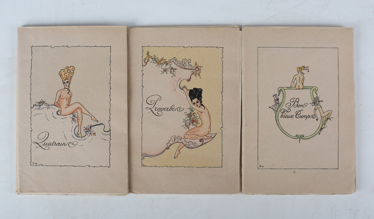 EROTICA. – Jacques VIALETAY (publisher). Proverbes, Quatrains, Bon Vieux Temps. [Paris: Jacques Vialetay, circa 1945.] 3 vols., limited edition being one of 300 copies, 8vo (250 x 163mm.) Hand-coloured pochoir illustrations of erotic scenes from 18th century aristocratic France, loose as issued, monogrammed ‘G.M.’ Original wrappers with hand-coloured pochoir illustrations to upper wrappers. Note: scarce (3).