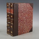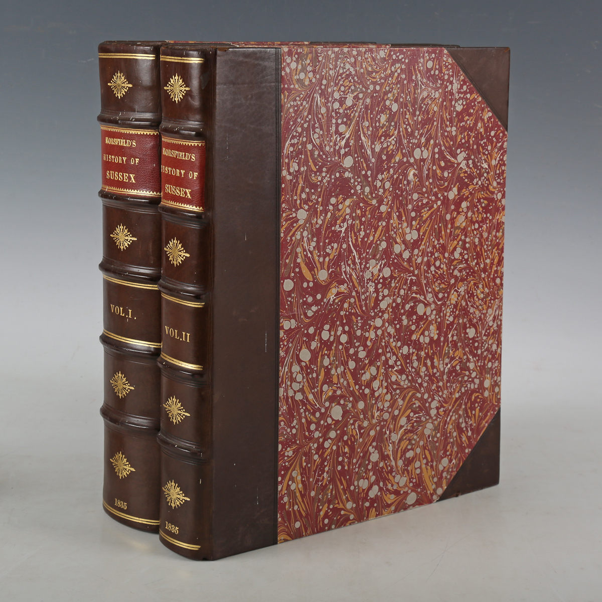 HORSFIELD, Thomas Walker. The History, Antiquities, and Topography of the County of Sussex. Lewes: Sussex Press, Baxter and Nichols and Son, 1835. 2 vols., first edition, 4to (319 x 248mm.) 2 engraved frontispieces, 54 engraved plates, tissue-guards, 2 large engraved folding maps of Sussex, numerous illustrations in the text. (Marginal spotting throughout, heavily damp-stained frontispiece to vol. 2, browning and crease tears to maps, blanks replaced, marginal paper repairs to vol. 1.) Late 20th century brown half calf over marbled paper-covered boards, red morocco lettering pieces to the spines (endpapers replaced, minor marks) (2).