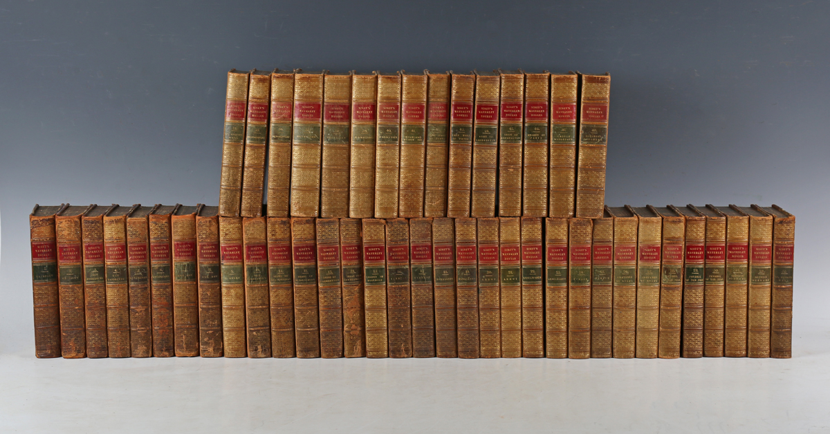 SCOTT, Walter. [The Waverley Novels.] Edinburgh: Adam and Charles Black, 1851-1852. 48 vols., 8vo (162 x 97mm.) 48 engraved frontispieces and additional engraved titles. (Toning, offsetting to additional plates.) Contemporary half calf over marbled paper-covered boards, red and green morocco lettering pieces to spines (some volumes rebacked, scuffing and sunning to several spines, spine ends rubbed) (48).