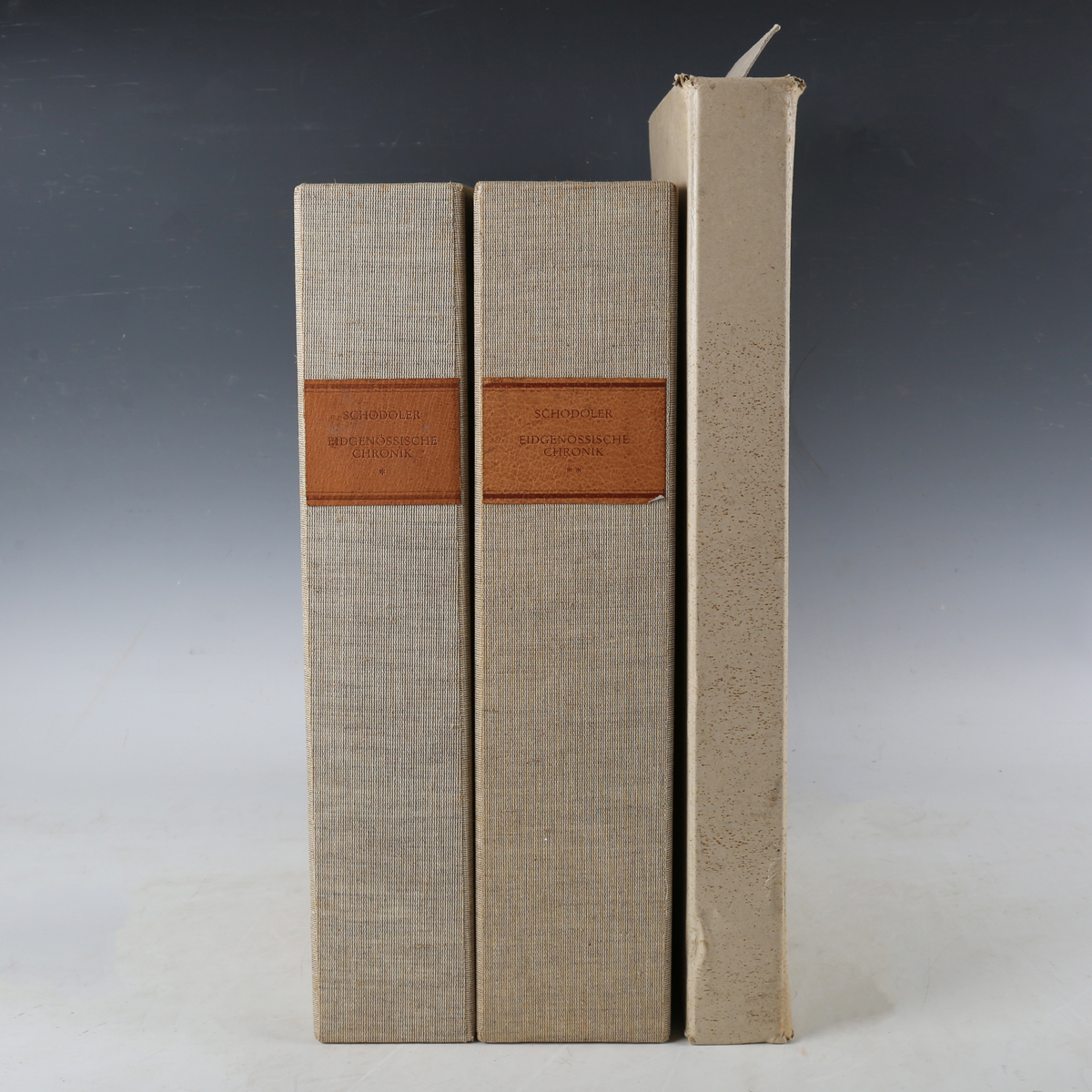 SCHODOLER, Wernher. Die Eidgenössische Chronik des…um 1510 bis 1535. Lucerne: Faksimile-Verlag, 1980-1983. 3 vols., limited edition, being one of 980 copies, folio (404 x 287mm.) 2 facsimile volumes with colour illustrations, commentary volume by Walther Benz & others, and prospectus. Original blind-stamped pigskin, brass bosses and clasps, original cloth slipcases with pigskin labels to spines. Note: contains the facsimiles of three manuscripts: MS 62 in Leopold-Sophien-Bibliothek Überlingen; MS 2 Stadtarchiv Bremgarten; MS Bibl. Zurl. Fol. 18 Aargauischen kantonsbibliothek Aarau. Provenance: Roald and Pat Knutson (bookplate to front pastedown) (3).
