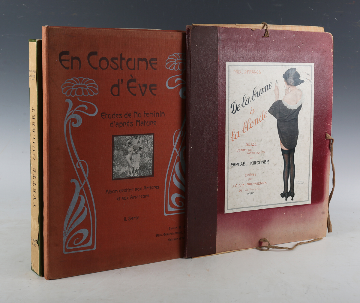 TOULOUSE-LAUTREC, Henri de. – Claude ROGER-MARX. Yvette Guilbert vue par Toulouse-Lautrec. Paris: Au Pont des Arts, 1950. Limited edition, folio (376 x 289mm.) 37 loose-leaf lithographed plates, 27 in green and 10 in black and white, text leaves. (Lacking 24 plates, occasional toning, and finger-mark, ink date to title.) Original card wrappers in colour, original green cloth-backed covers, mounted paper label to spine (some loss to label). – And two further volumes (Richard Eckstein’s ‘En Costume d’ Eve, Etudes de nu Feminin d’apres Nature’, Series II, [13 plates, of 20], [circa 1920], folio, and Raphael Kirchner’s ‘De la Brune a la Blonde’, [14 plates, of 17], [circa 1914], folio) (3).