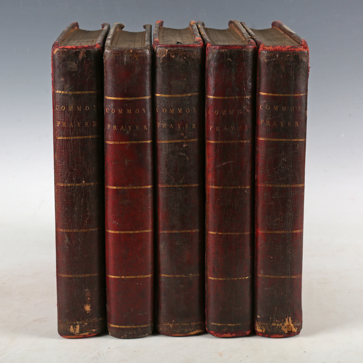 COMMON PRAYER, In English. The Book of Common Prayer, and Administration of the Sacraments, and Other Rites and Ceremonies of the Church. Oxford: at the Clarendon Press, by Dawson, Bensley, and Cooke, 1806. Title. (Occasional spotting, marginal spotting to first leaves.) [Bound with:] A New Version of the Psalms of David. London: for the Company of Stationers, 1807. (Toning.) 4to (286 x 220mm.) Contemporary red morocco, g.e. (some fading and discolouring, scuffing). Provenance: Corporation of Bedford (gilt to upper cover). – And a further four copies of the same volume (5).