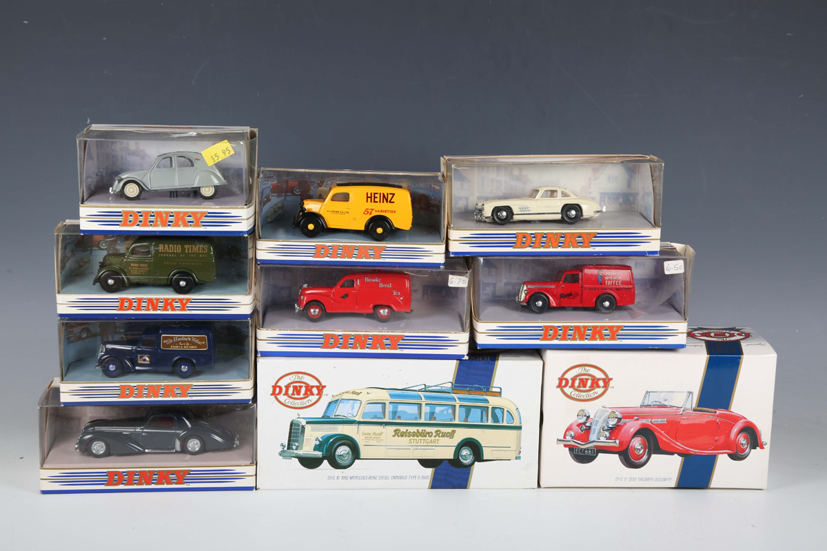 A small group of Matchbox The Dinky Collection vehicles, including DY-S10 1950 Mercedes-Benz diesel omnibus, DY-S7 1939 Triumph Dolomite and DY-15B 1953 Austin A40, together with a Group of Atlas Edition model buses and coaches, mostly boxed.
