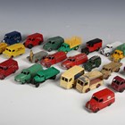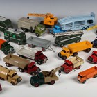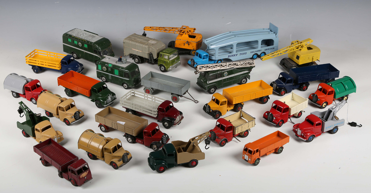 A collection of Dinky Toys and Supertoys vehicles, including Nos. 967, 968 and 969 BBC vehicles, four No. 1132 Carrimore low loaders, Bedford refuse lorries, Bedford tipper trucks, Leyland Comet Pullmore car transporter, Dodge wagons, two 25 Series wagons, Trojan vans and tankers (playwear, repainting and alterations).