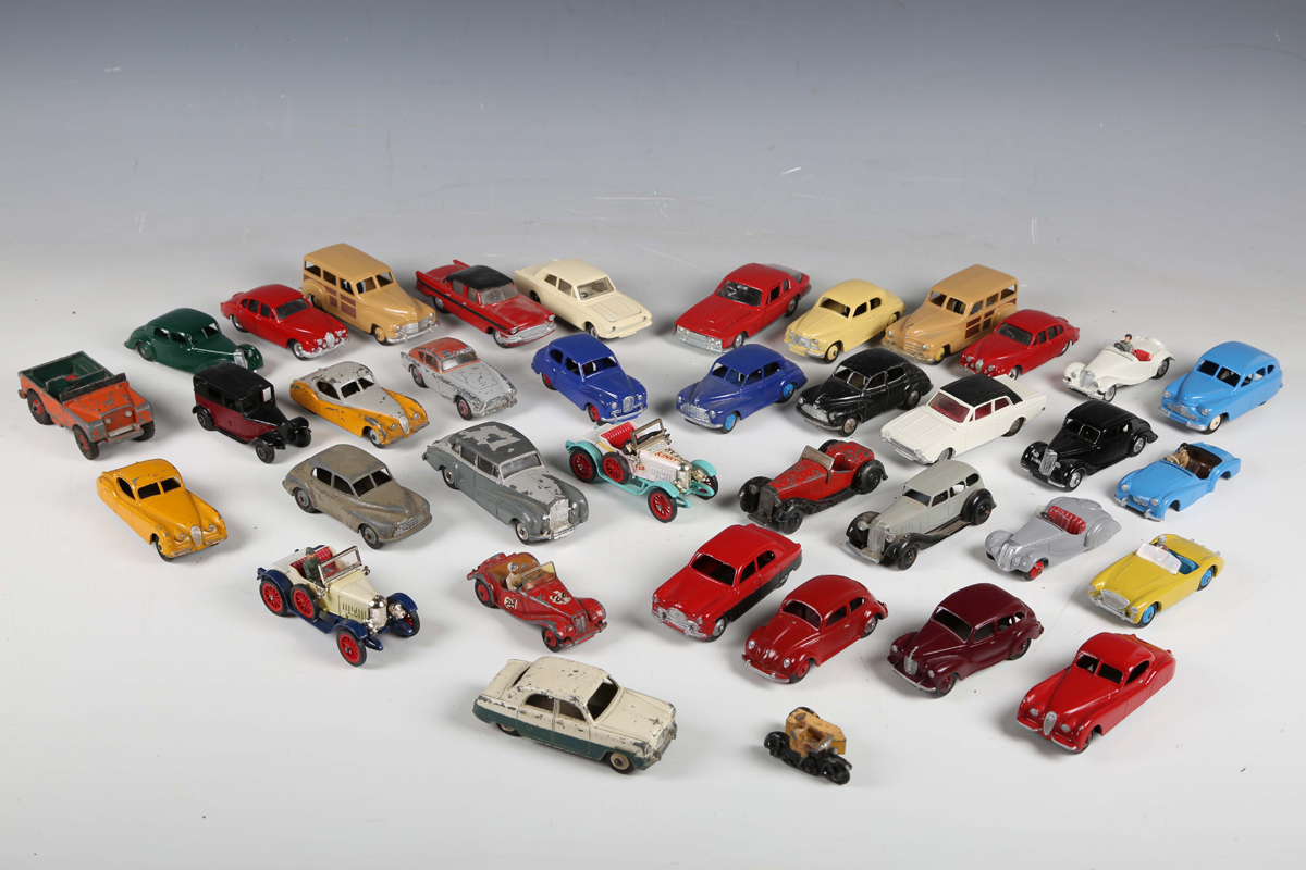 A collection of Dinky Toys vehicles, including three No. 157 Jaguars, two No. 162 Ford Zephyrs, two No. 344 estate cars, No. 108 MG Midget, No. 40J Austin Somerset, Frazer-Nash and AA motorcycle and sidecar (paint chips, repainting and restoration).
