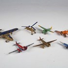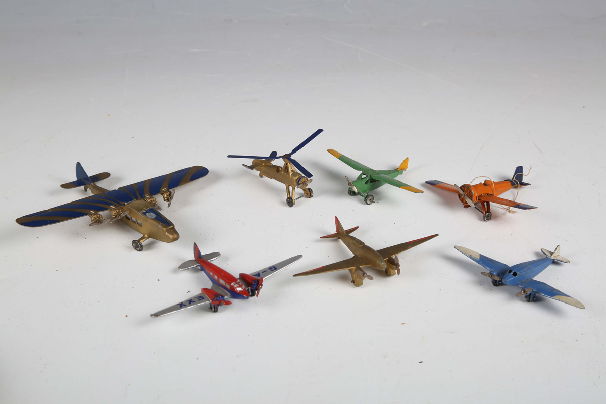 Seven pre-war Dinky Toys aircraft, comprising No. 62K The King's Aeroplane G-A EXX in silver, red and blue, No. 60B De Havilland Leopard Moth in green and yellow, No. 60D Low Wing Monoplane in orange and blue, No. 60a Imperial Airways Liner in blue and gold, No. 60e General Monospar in blue and white, No. 60f Cierva Autogiro in gold and blue, and No. 60g De Havilland Comet in gold and red (some damage and paint chips).