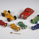 Seven pre-war Dinky Toys cars, comprising No. 30a Chrysler Airflow in red with plated hubs, No. 23c Mercedes-Benz racing car in yellow, No. 236 Hotchkiss racing car in green with yellow flashes, and four No. 35c MG sports cars (paint chips and tyres missing).