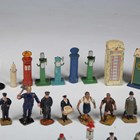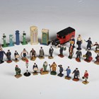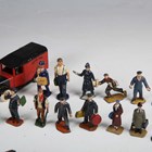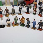 A collection of pre-war Dinky Toys accessories, including Royal Mail delivery van, tinplate RAC telephone box, three petrol pumps, post box, Air Mail post box, telephone box, road signs, station staff passengers and other figures (paint chips, mail van fatigued), together with a Dinky Toys No. 48 petrol station box base (torn).