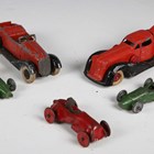 A pre-war Tootsietoy roadster in red and black, together with a Manoil tow truck, two lead racing cars and a tinplate racing car (paint chips and faults).