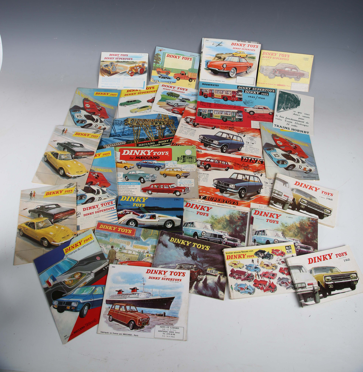 A collection of French Dinky Toys catalogues, including April 1956, two 1966, 1965 and 1968.
