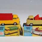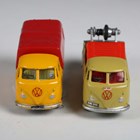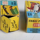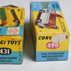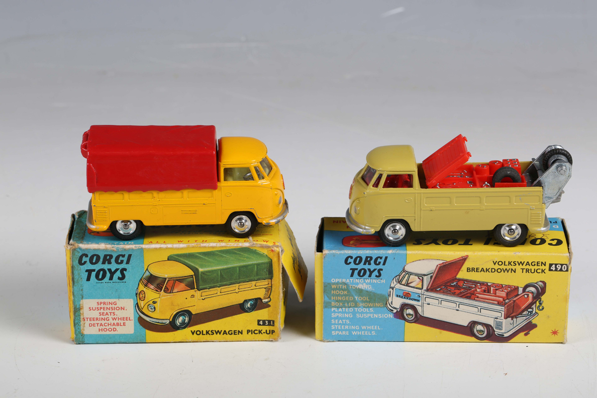 A Corgi Toy No. 431 Volkswagen Pick-Up in yellow with red canopy, and a No. 490 Volkswagen Breakdown Truck, both boxed (some minor paint chips, No. 490 box lightly creased and scuffed, No. 431 box creased, torn and scuffed and lacking end flap).