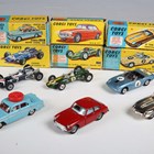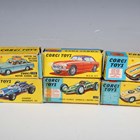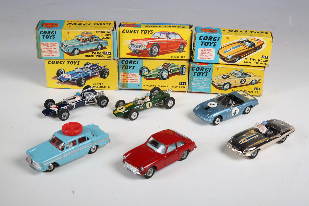 Six Corgi Toys cars, comprising No. 312 'E' Type Jaguar Competition Model, No. 318 Lotus Elan S2, No. 327 MGB GT, No. 236 Austin A60 De Luxe Saloon Corgi Motor School Car, No. 156 Cooper Maserati F1 and No. 155 Lotus-Climax F1 Racing Car, all boxed (some minor paint chips, boxes creased, scuffed and sellotaped, Lotus box lacking end flap and tabs).