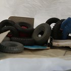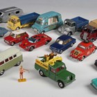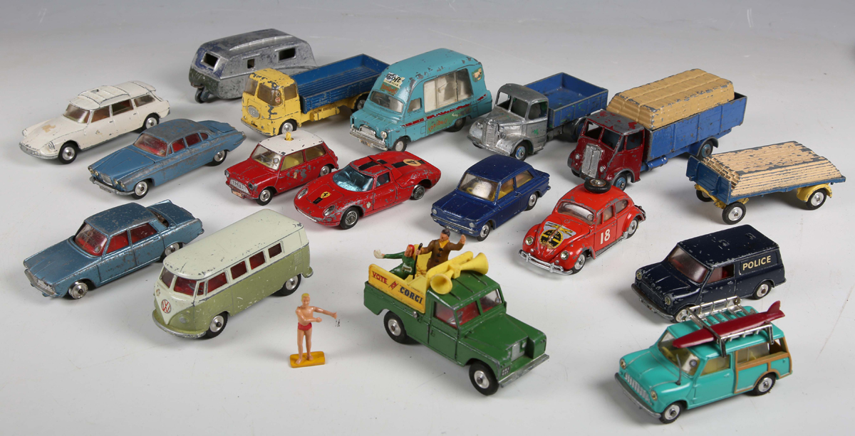 A group of diecast vehicles, including Tri-ang Spot-On No. 265 Tonibell Ice Cream Van, Dinky Toys No. 511 Guy 4-ton lorry, Corgi Toys No. 472 Public Address Vehicle 'Vote For Corgi' and Corgi No. 485 Surfing with the BMC Mini-Countryman (playwear), together with a group of other vehicles' tyres, stickers and figures.
