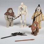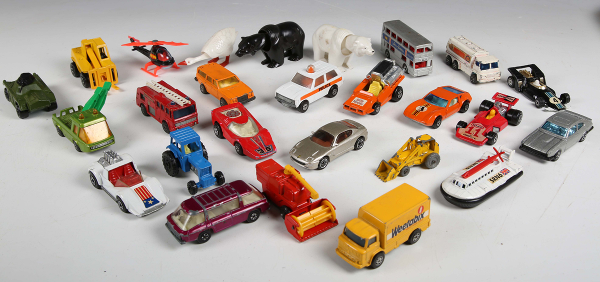 A small group of Matchbox Superfast and other vehicles, including No. 20 Rolamatics Police Patrol Car, No. 3 Monteverdi, No. 42 Tyre Shredder, Corgi Juniors Batcopter and Volvo 245 CL, together with four Star Wars figures and Logray's staff (playwear).