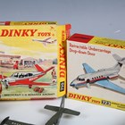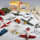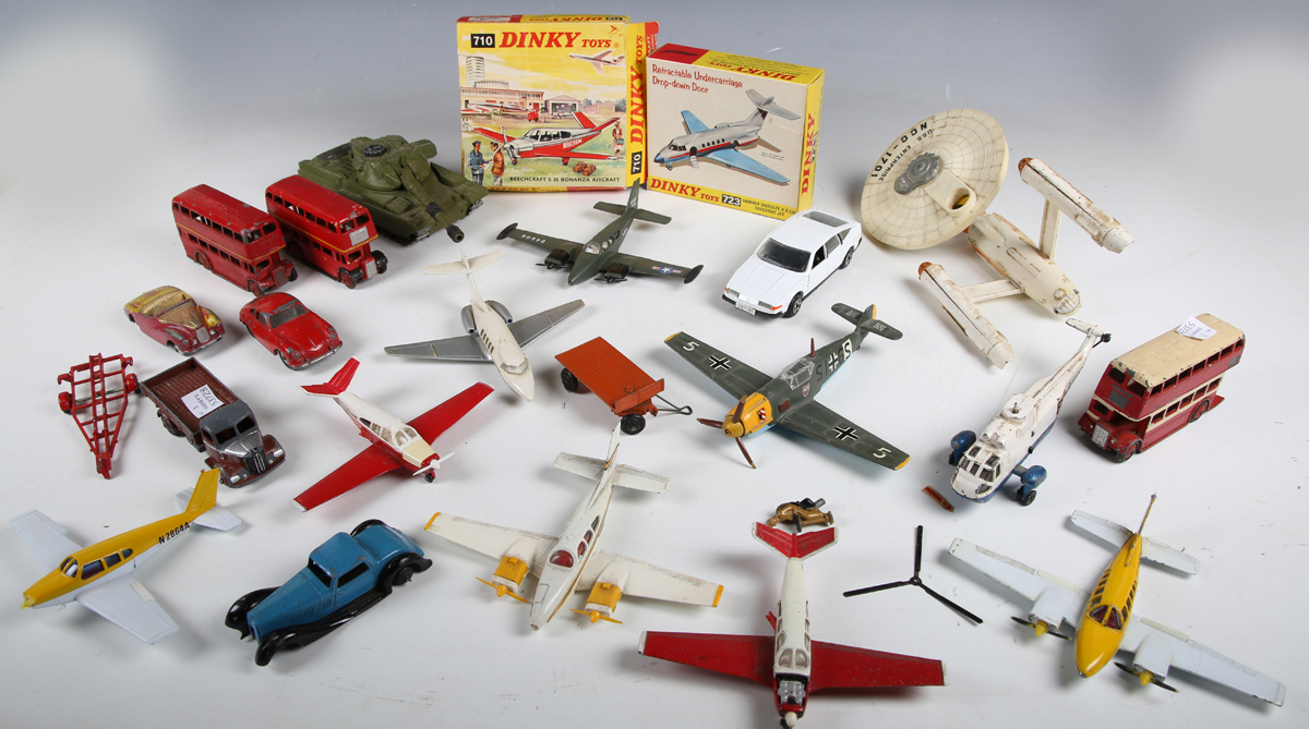 A collection of Dinky Toys models, including No. 723 Hawker Siddeley HS 125 jet, other aircraft, three double-decker buses, cars and USS Enterprise, boxed and loose (playwear and faults, boxes creased and scuffed).