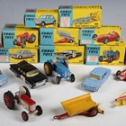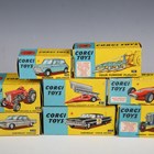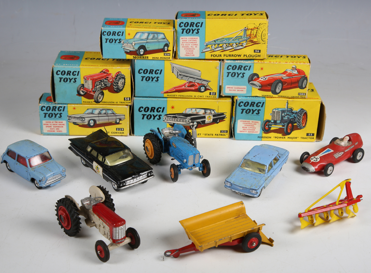 A group of Corgi Toys vehicles, including No. 223 Chevrolet State Patrol car, No. 55 Fordson Power Major tractor, No. 50 Massey-Ferguson 65 tractor, Ecurie Ecosse racing car transporter and two No. 150S Vanwall racing cars, boxed and loose, together with two Bburago Ferrari F40 cars (playwear, paint chips, boxes creased and scuffed).