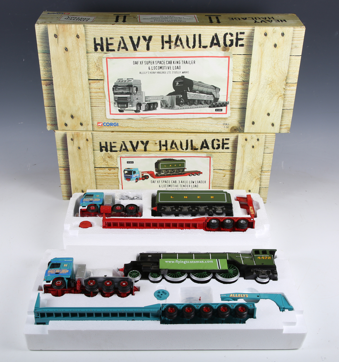 Two Corgi limited edition 1:50 scale Heavy Haulage truck sets, comprising CC13203 DAF XF Super Space Cab, King Trailer & Locomotive Load 'Allely's Heavy Haulage Ltd', and CC13213 DAF XF Space Cab 3 Axle Low Loader & Locomotive Tender Load 'Allely's Heavy Haulage Ltd', both boxed (boxes lightly scuffed to corners).