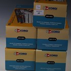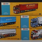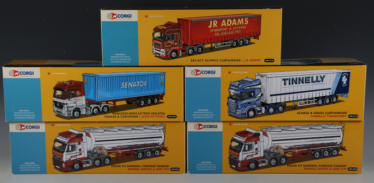 Five Corgi limited edition 50th Anniversary articulated trucks, comprising two AN14001 Volvo FH General Purpose Tanker 'Mansel Davies & Son Ltd', AN13805 Mercedes-Benz Actros Skeletal Trailer & Container 'John Mitchell', AN13710 Scania R Series Curtainside 'Tinnelly Transport', and AN13418 ERF ECT Olympic Curtainside 'J.R. Adams', all boxed, four with certificates.
