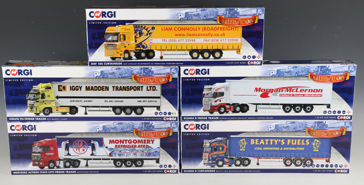 Five Corgi limited edition 1:50 scale Hauliers of Renown articulated lorries, comprising CC13755 Scania R Curtainside 'Beatty's Fuels', CC13826 Mercedes Actros 'Montgomery Refrigerated', CC13751 Scania R 'Morgan McLernon', CC14029 Volvo FH 'Iggy Madden Transport Ltd', and CC14115 DAF 105 'Liam Connolly (Roadfreight)', all boxed with certificates.