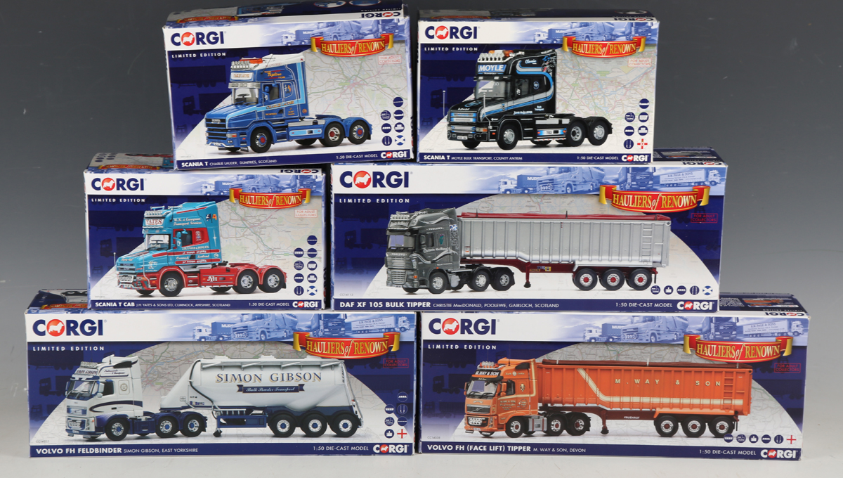 Three Corgi 1:50 scale Hauliers of Renown articulated lorries, comprising CC14035 Volvo FH 'Simon Gibson', CC14038 Volvo FH with tipper trailer 'M. Way & Son' and CC14113 DAF XF 113 'Christie MacDonald', together with three Hauliers of Renown tractor units, comprising CC12834 Scania T 'Charlie Lauder', CC12827 Scania T 'Moyle Bulk Transport' and CC12836 Scania T 'J.H. Yates & Sons Ltd', all boxed with certificates.