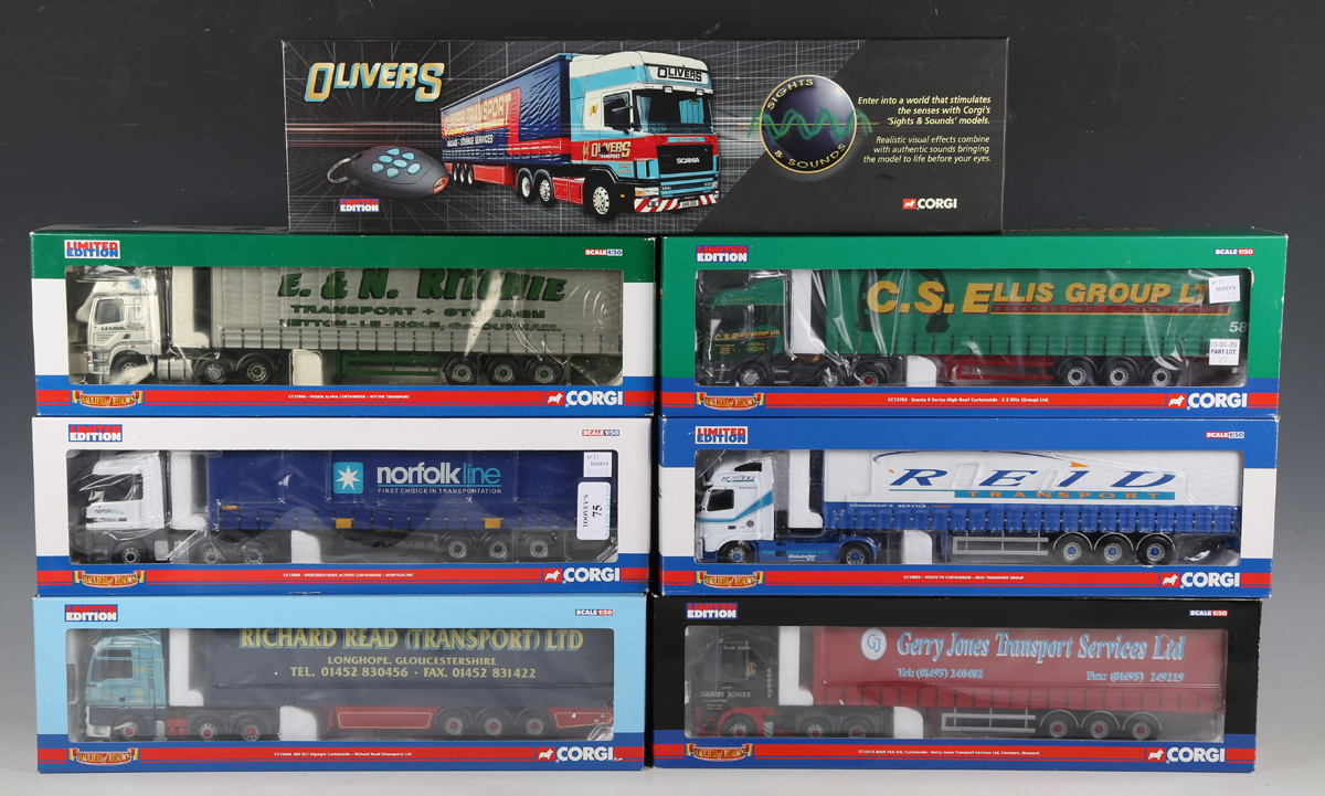Seven Corgi limited edition 1:50 scale articulated curtainside lorries, comprising Sights and Sounds CC12937 Scania Topline 'Olivers Transport', CC13906 Foden Alpha 'Ritchie Transport', CC13806 Mercedes-Benz Actros 'Norfolkline', CC14003 Volvo FH 'Reid Transport Group', CC13703 Scania R Series 'C.S. Ellis (Group) Ltd', CC13408 ERF ECT Olympic 'Richard Read (Transport) Ltd', all boxed with tachograph type certificates, and CC13412 MAN TGA 'Gerry Jones Transport Services Ltd Cwmcarn, Newport', boxed with certificate, instructions and key fob.