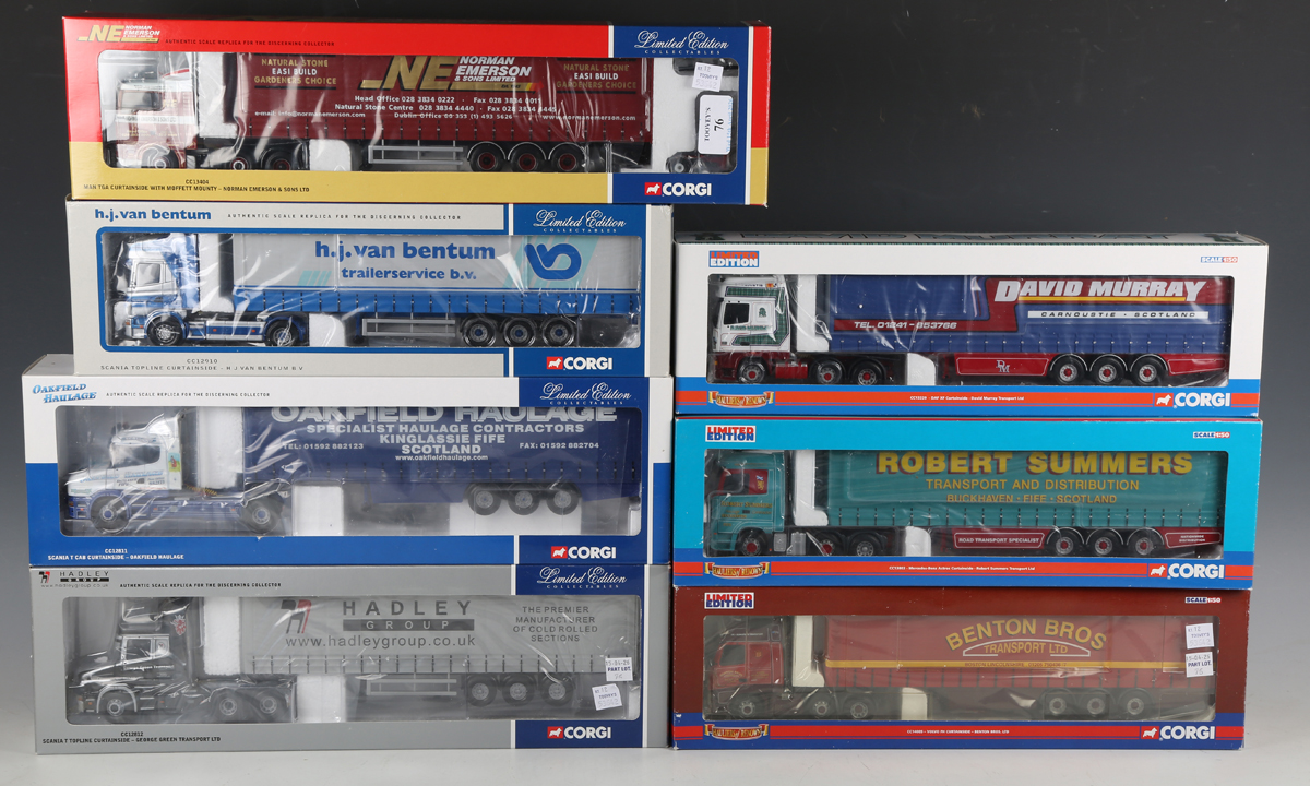Seven Corgi limited edition 1:50 scale articulated curtainside lorries, comprising CC13404 MAN TGA 'Norman Emerson & Sons Ltd', CC12812 Scania T Topline 'George Green Transport Ltd', CC12811 Scania T Cab 'Oakfield Haulage', CC12910 Scania Topline 'H.J. Van Betum', CC14005 Volvo FH 'Benton Bros Ltd', CC13803 Mercedes-Benz Actros 'Robert Summers Transport Ltd' and CC13229 DAF XF 'David Murray Transport Ltd', all boxed with tachograph type certificates.