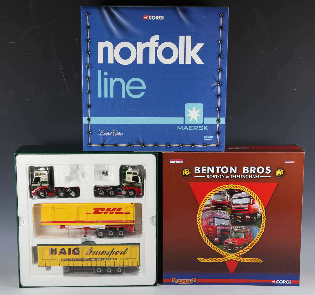 Three Corgi limited edition 1:50 scale commercial vehicle sets, comprising CC99173 Benton Bros Boston & Immingham, CC99192 Haig Transport and CC99192 Norfolk Line, all boxed, two with certificates (Haig Transport certificate missing).