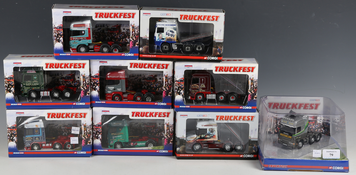 Nine Corgi Truckfest limited edition 1:50 scale tractor units, comprising CC13220 DAF XF Space Cab 'Robert Laidlaw', CC13232 DAF XF Super Cab 'Beamish Transport', CC14110 DAF 105 XF Colin McRae Tribute, CC13244 DAF XF 'R. Flynn & Sons', CC13245 DAF XF 'J.R. Adams', CC13702 Scania R Series 'Garn Transport', CC12826 Scania T Topline 'Wayne Catt Transport', CC13704 Scania R Series 'Pollock (Scotrans) Ltd', all boxed with certificates, and CC12923 Scania Topline 'Macfarlane Transport Ltd', within a plastic display case.