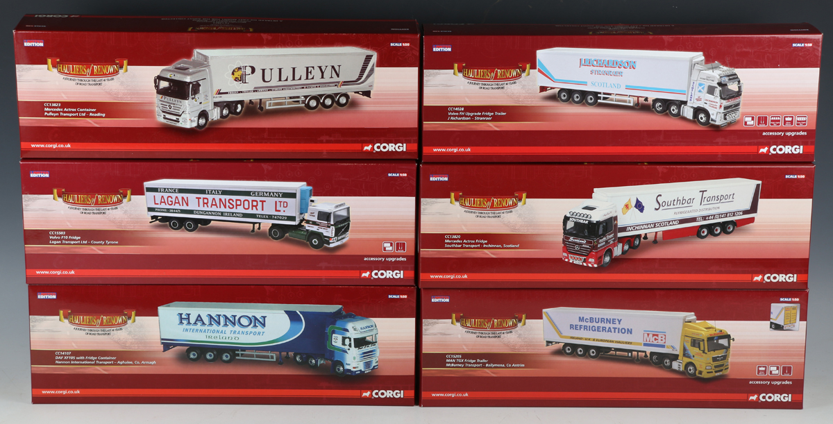 Five Corgi limited edition 1:50 scale Hauliers of Renown articulated fridge lorries, comprising CC14107 DAF XF105 'Hannon International Transport', CC15205MAN TGX 'McBurney Transport', CC13820 Mercedes-Benz Actros 'Southbar Transport', CC15503 Volvo F10 'Lagan Transport Ltd' and CC14028 Volvo FH 'J. Richardson', together with a CC13823 Mercedes Actros Container 'Pulleyn Transport Ltd', all boxed with certificates.