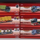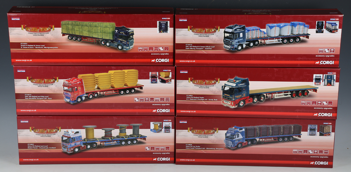 Six Corgi limited edition 1:50 scale Hauliers of Renown articulated flatbed lorries, comprising CC14026 Volvo FH Log Trailer 'Steve Swain Transport Ltd', CC14031 Volvo FH 'Robert Porter', CC14021 Volvo FH 'R.C. Robinson's Haulage Ltd', CC1411 DAF 105 Flatbed and Skip Load 'Paul Hinchliffe Transport Ltd', CC14112 DAF 105 Flatbed & Cement Block Load 'Keith Murray Transport' and CC13721 Scania R Flatbed & Straw Load 'G. Owen & Sons', all boxed with certificates.