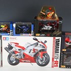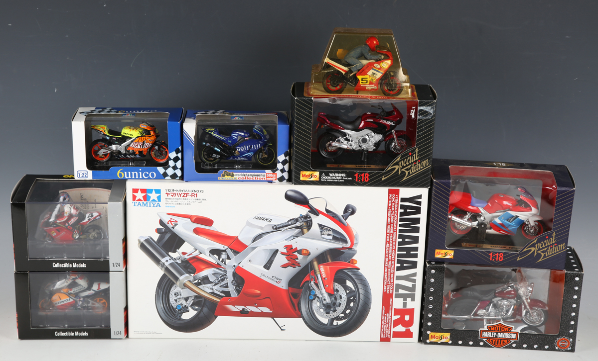 Two Onyx Models 1:24 scale racing motorcycles, comprising XM021 Honda NSR V4 Michael Doohan and XM060 Ducati 916 Carl Fogarty, six other model motorcycles and a Tamiya 1:12 scale Yamaha R1 model kit, boxed.