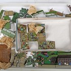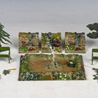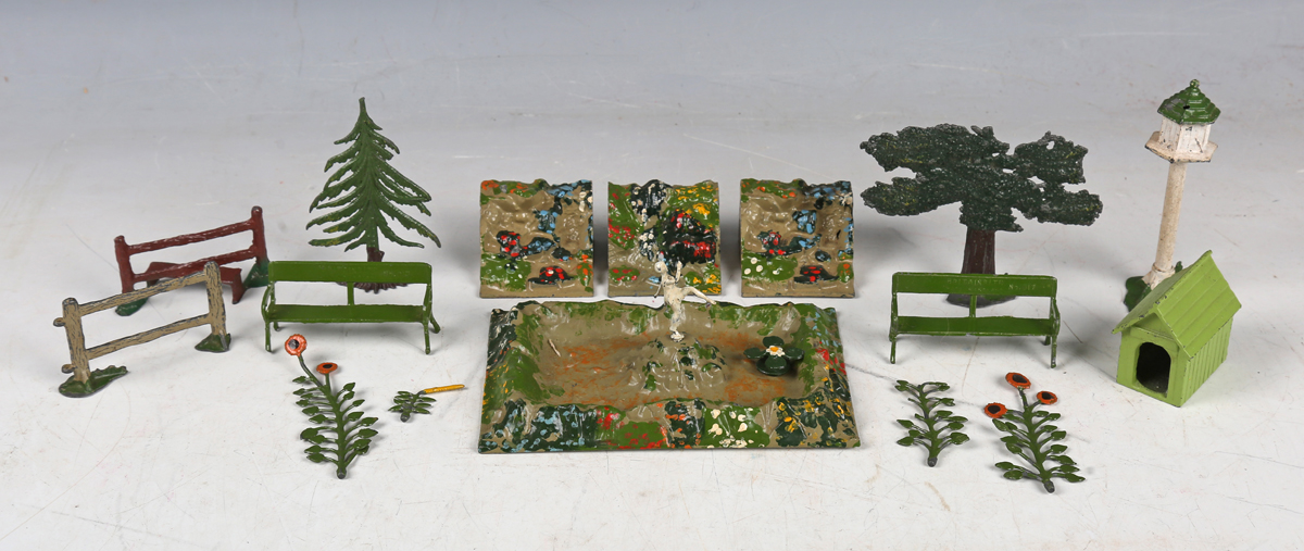 A collection of Britains lead Miniature Garden Series items, including No. 28MG garden shelter, No. 067 lily pond with nymph, rockery, flower beds, rockery, crazy paving, plants, trees, benches and accessories.
