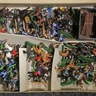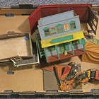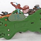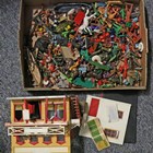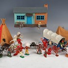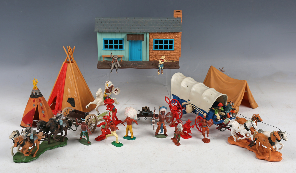 A collection of Britains, Timpo and Lone Star plastic figures and accessories, including Confederate horse-drawn limber and cannon, US Mail stage coach, Native Americans, fort, teepees and buildings (playwear).
